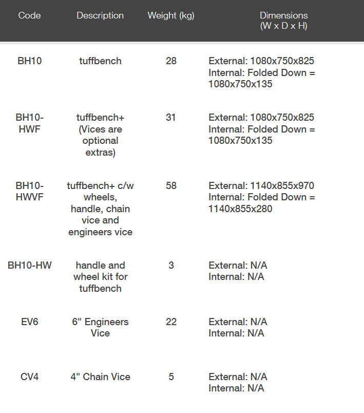 The newest addition is the TuffBench+, which is the same robust build as the TuffBench™, pre-fitted with a handle and wheels to ease the movement of the TuffBench™, particularly when vices are fitted.