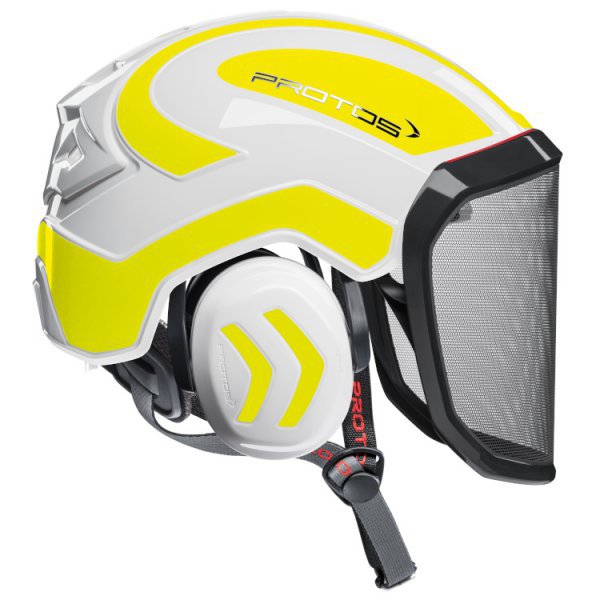 - Protos® Arborist is equipped with a maclip chin strap and Koroyd Crash Absorber.